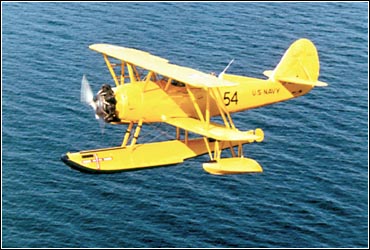 It was a very special surprise for this landlubber to be offered a trip in the N3N, my first open-cockpit flight since I had flown a Tiger Moth of 130 Squadron from Catterick in 1943. In my borrowed leather jacket and helmet and goggles, I felt singularly useless during the launching process. Climbing into the front cockpit was easy, however, and there was plenty of room among the sparse but adequate instruments and controls.