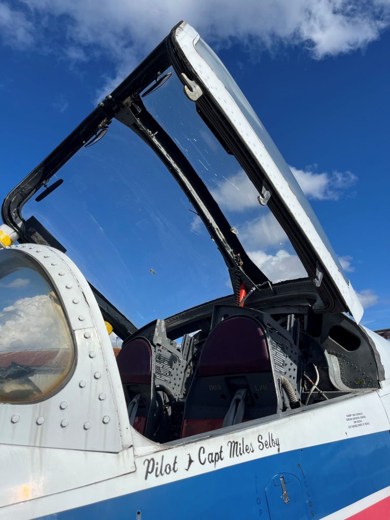 The Tutor we specifically wanted to acquire was RCAF 26003, and it has been repainted as Snowbird 8, in the colours of Snowbird pilot Captain Miles Selby, who was tragically killed while flying an Tutor as part of the Snowbird team.