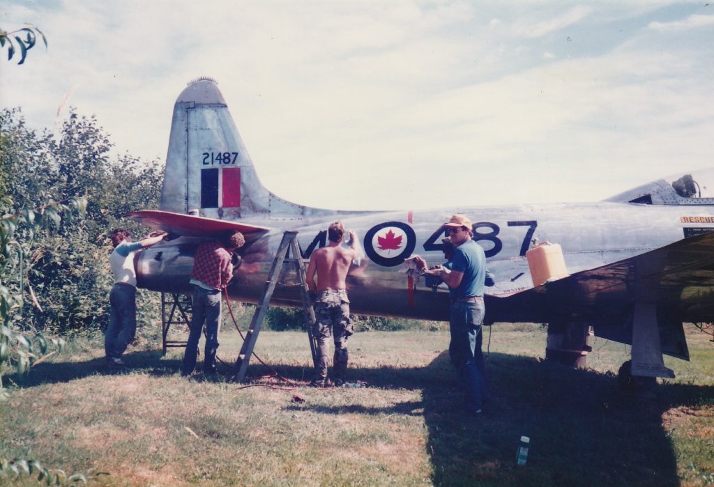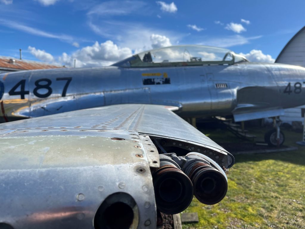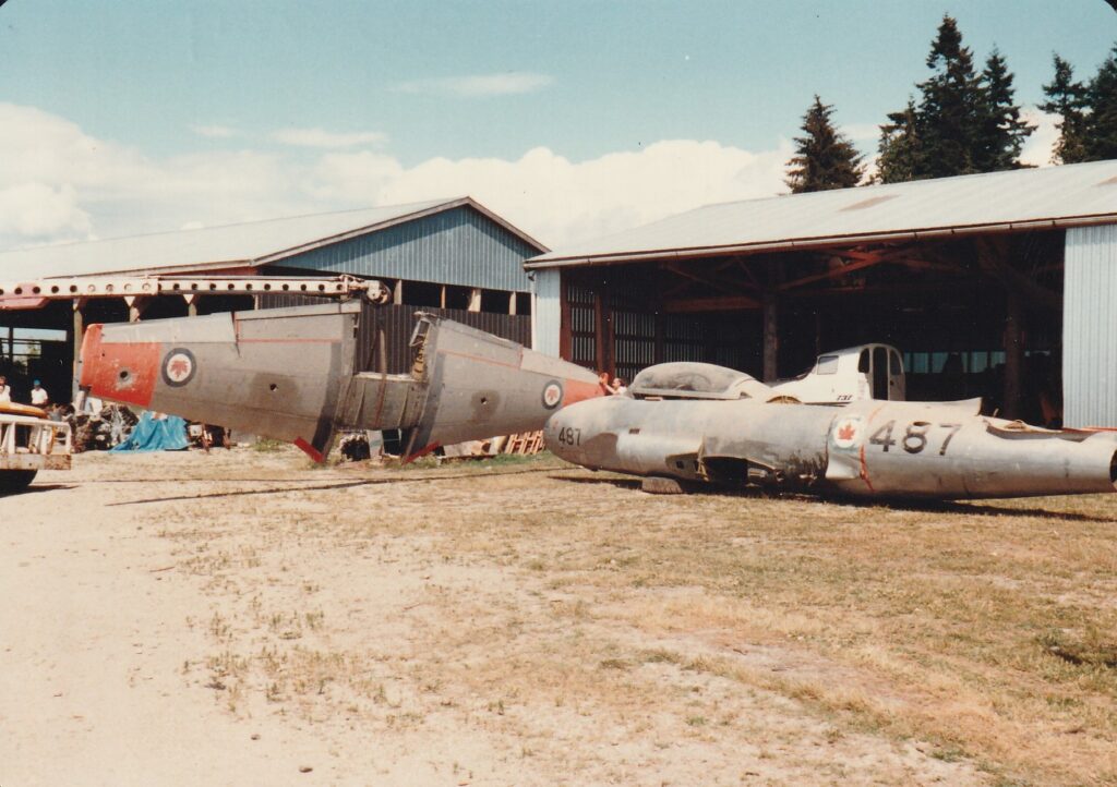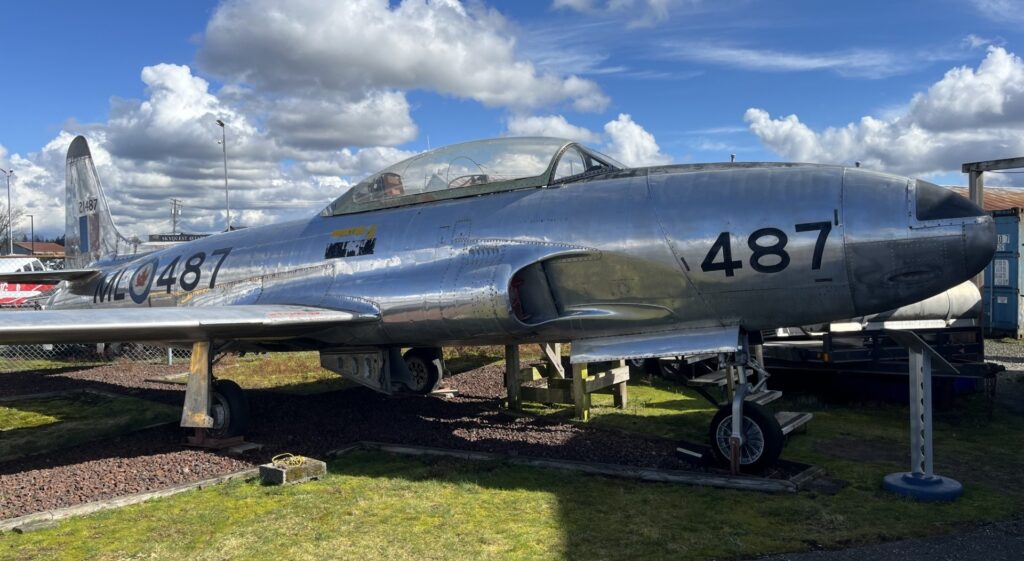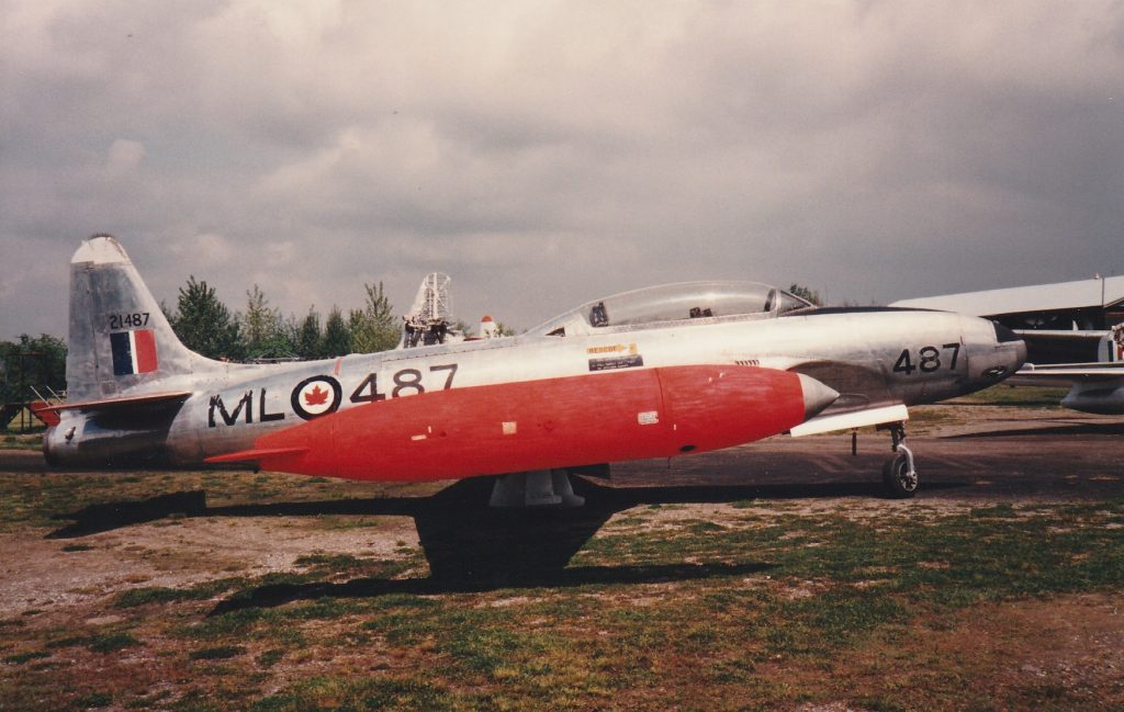 Our T-33, a Canadair T-33AN Silver Star Mk.3 built in 1955, became a member of the Royal Canadian Air Force’s fleet of jet trainers in that same year, and was assigned serial RCAF 21487. This aircraft served at Canadian Forces Base (CFB) Gimli in Manitoba, where it was utilized for both RCAF and NATO pilot training programs. It bore the code “ML-487,” with “ML” designating its assignment to the 3 Advanced Flying School (3 AFS) at CFB Gimli.By 23 June 1959 it was put into Long Term storage at RCAF Station MacDonald, near Portage la Prairie, Manitoba. It was then moved to Inactive Reserve in Lethbridge, Alberta in 1963 and then put up for sale by Crown Assets Disposal Corp. In 1967 it was purchased by Northwest Industries, Edmonton AB along with over 100 other decommissioned T-33’s and of those examples, they donated RCAF 21487 to the Canadian Museum of Flight in 1977.