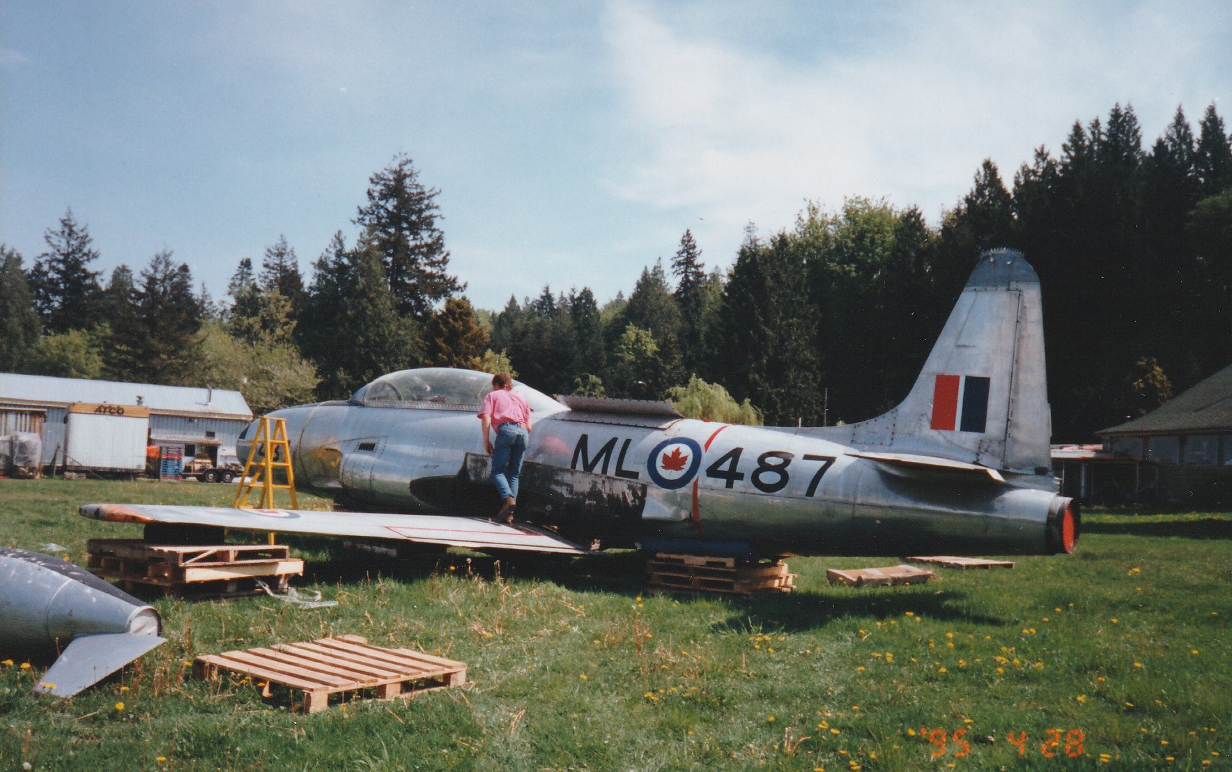 Our T-33, a Canadair T-33AN Silver Star Mk.3 built in 1955, became a member of the Royal Canadian Air Force’s fleet of jet trainers in that same year, and was assigned serial RCAF 21487. This aircraft served at Canadian Forces Base (CFB) Gimli in Manitoba, where it was utilized for both RCAF and NATO pilot training programs. It bore the code “ML-487,” with “ML” designating its assignment to the 3 Advanced Flying School (3 AFS) at CFB Gimli.By 23 June 1959 it was put into Long Term storage at RCAF Station MacDonald, near Portage la Prairie, Manitoba. It was then moved to Inactive Reserve in Lethbridge, Alberta in 1963 and then put up for sale by Crown Assets Disposal Corp. In 1967 it was purchased by Northwest Industries, Edmonton AB along with over 100 other decommissioned T-33’s and of those examples, they donated RCAF 21487 to the Canadian Museum of Flight in 1977.